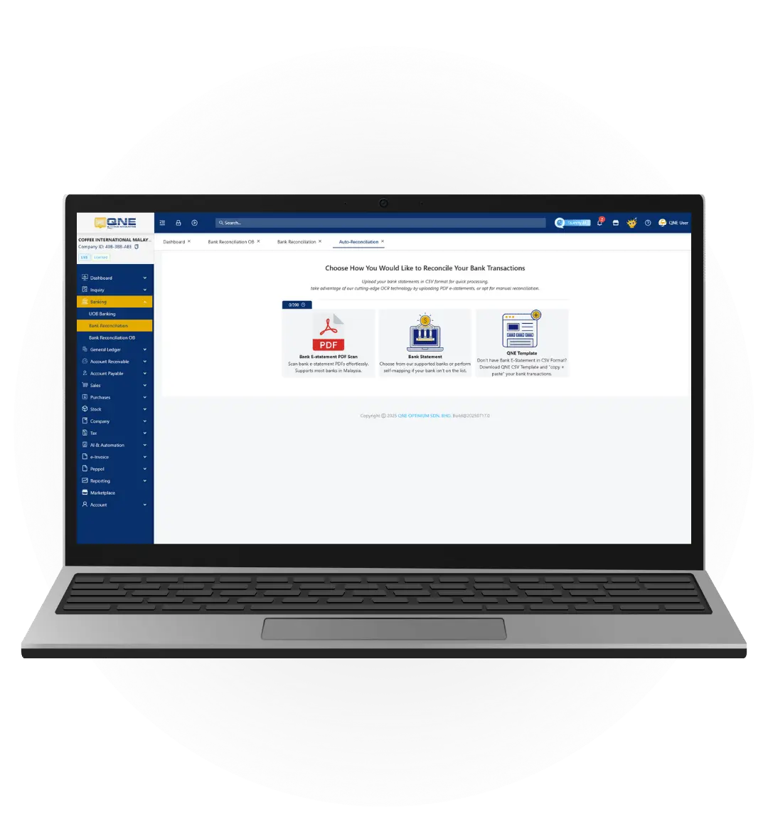 Automates transaction matching with your bank statement to save time and reduce errors. Upload your PDF bank statement, and QNE AI matches transactions, flags discrepancies, and ensures accurate reconciliation effortlessly.