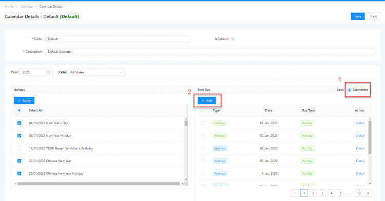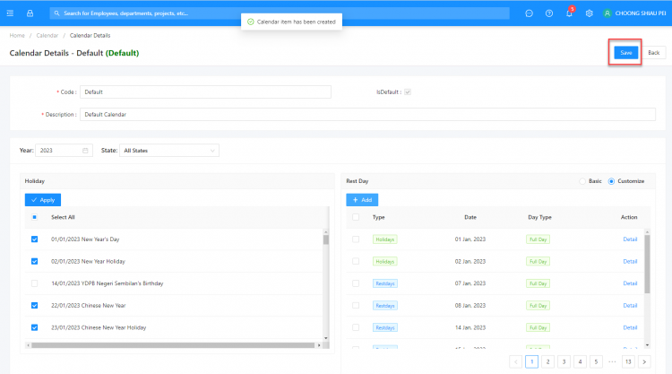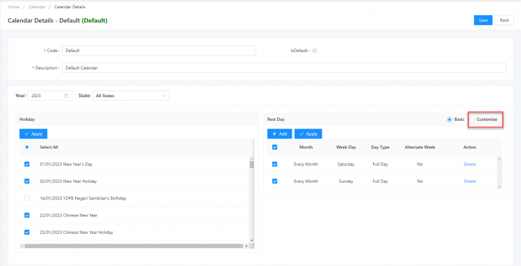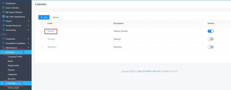 To add the additional 1-day Public Holiday for Aidilfitri in your company Calendar, go to Company > Calendar > Click into the Calendar