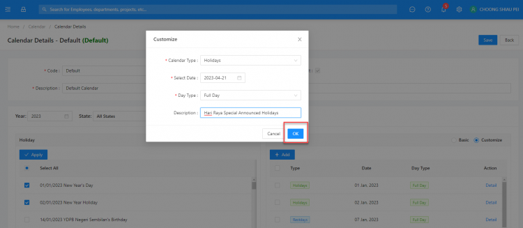 Fill in the Blank accordingly and Click OK to Save this customize holiday.