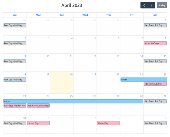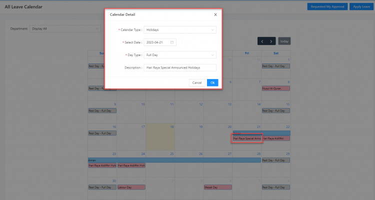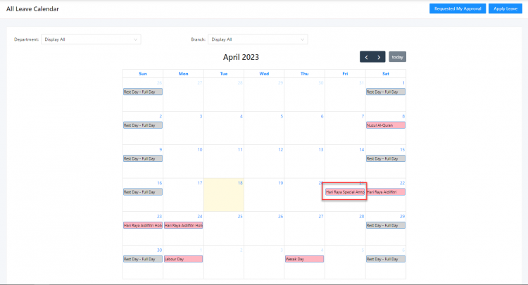 For example, the company have set 22nd, 23rd and 24th as the Public Holiday for Hari Raya Aidilfitri Celebration. Employee Aiman applied for her Raya Holiday Leave starting from 21st April until 28th April 2023 – total of 5 days annual leave and the leave application is approved before the announcement of the additional 1-day Public Holiday for Aidilfitri.