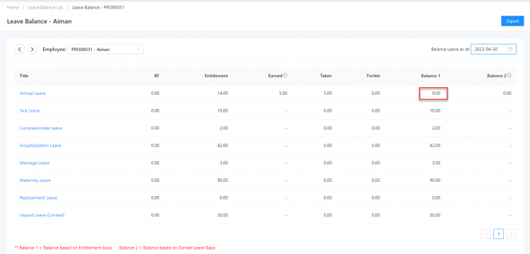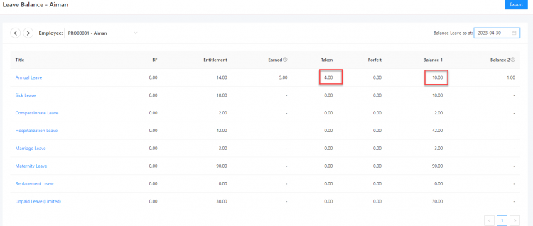 Balance as at 30/04/2023 is now 10 days, as the taken leave days is deducted due to the newly created additional 1-day Public Holiday for Aidilfitri.