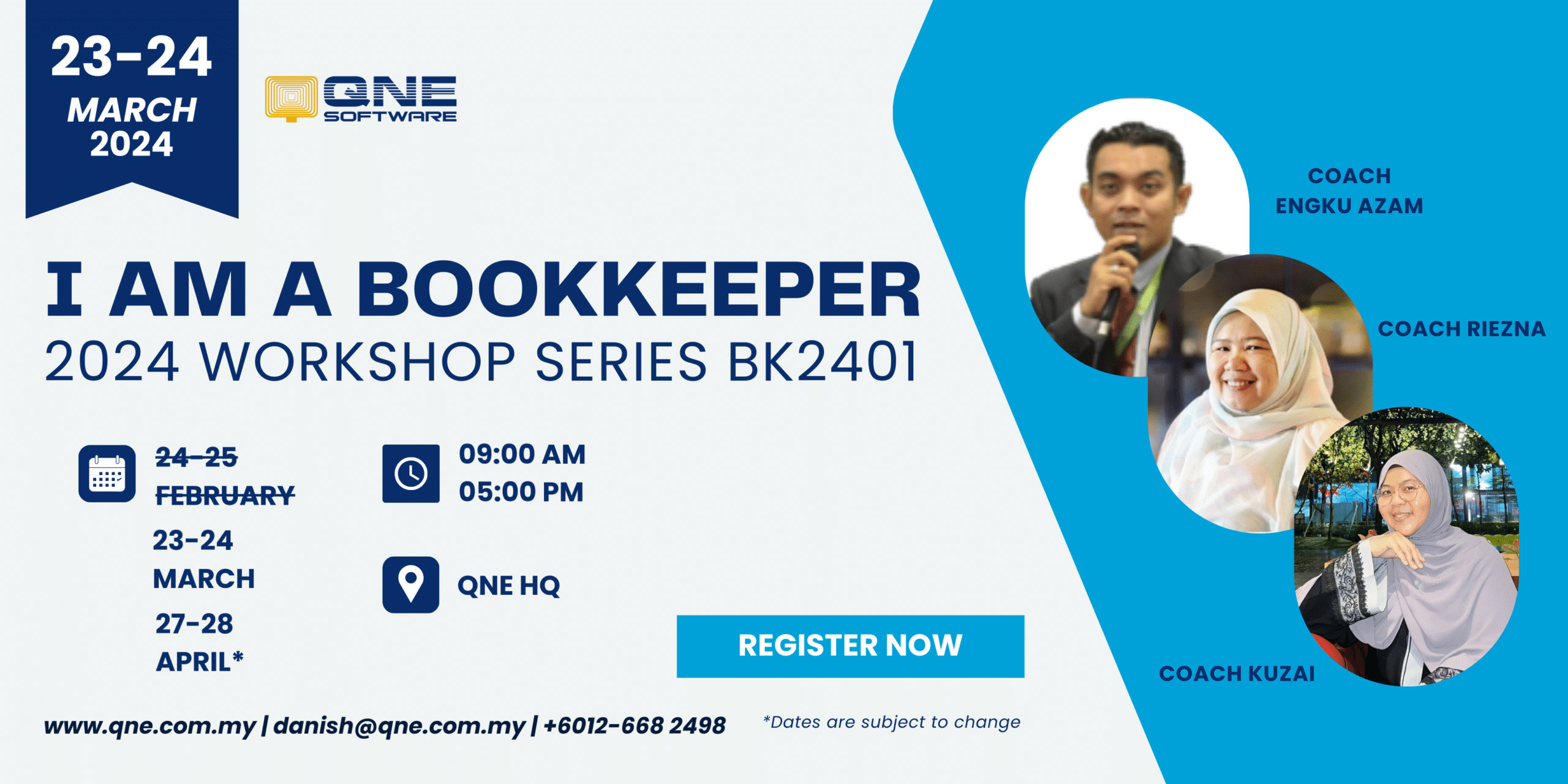March 23, 2024 @ 9:00 am - March 24, 2024 @ 5:00 pm I am a Bookkeeper 2024 Workshop Series BK2401 QNE HQ Suite 23-6, Plaza Cheong Hin, Jalan SP2/1, Section 2, Taman Serdang Perdana, 43300 Seri Kembangan, Selangor Darul Ehsan, Malaysia MYR900