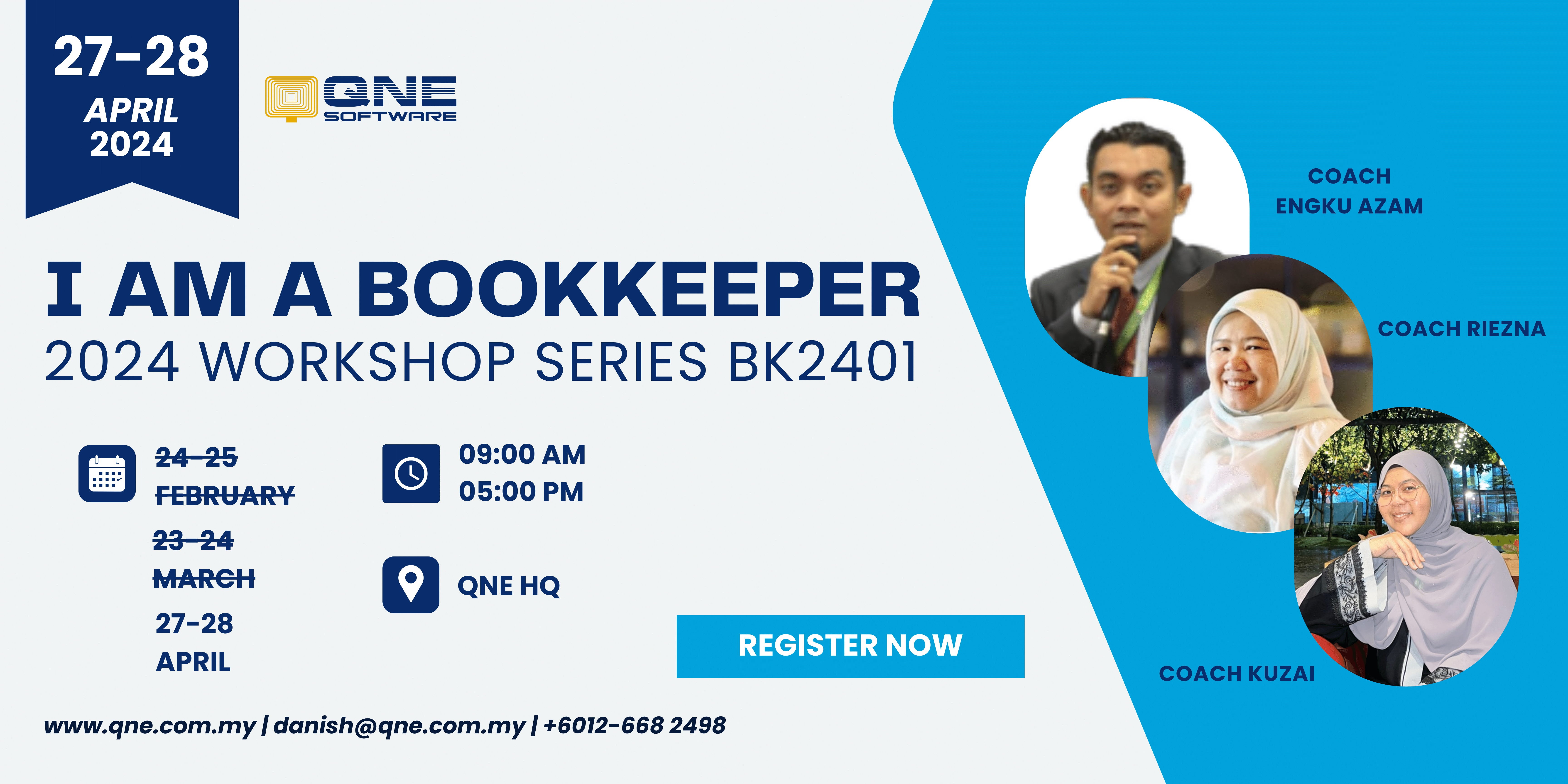 April 27, 2024 @ 9:00 am - April 28, 2024 @ 5:00 pm I am a Bookkeeper 2024 Workshop Series BK2401 QNE HQ Suite 23-6, Plaza Cheong Hin, Jalan SP2/1, Section 2, Taman Serdang Perdana, 43300 Seri Kembangan, Selangor Darul Ehsan, Malaysia MYR900
