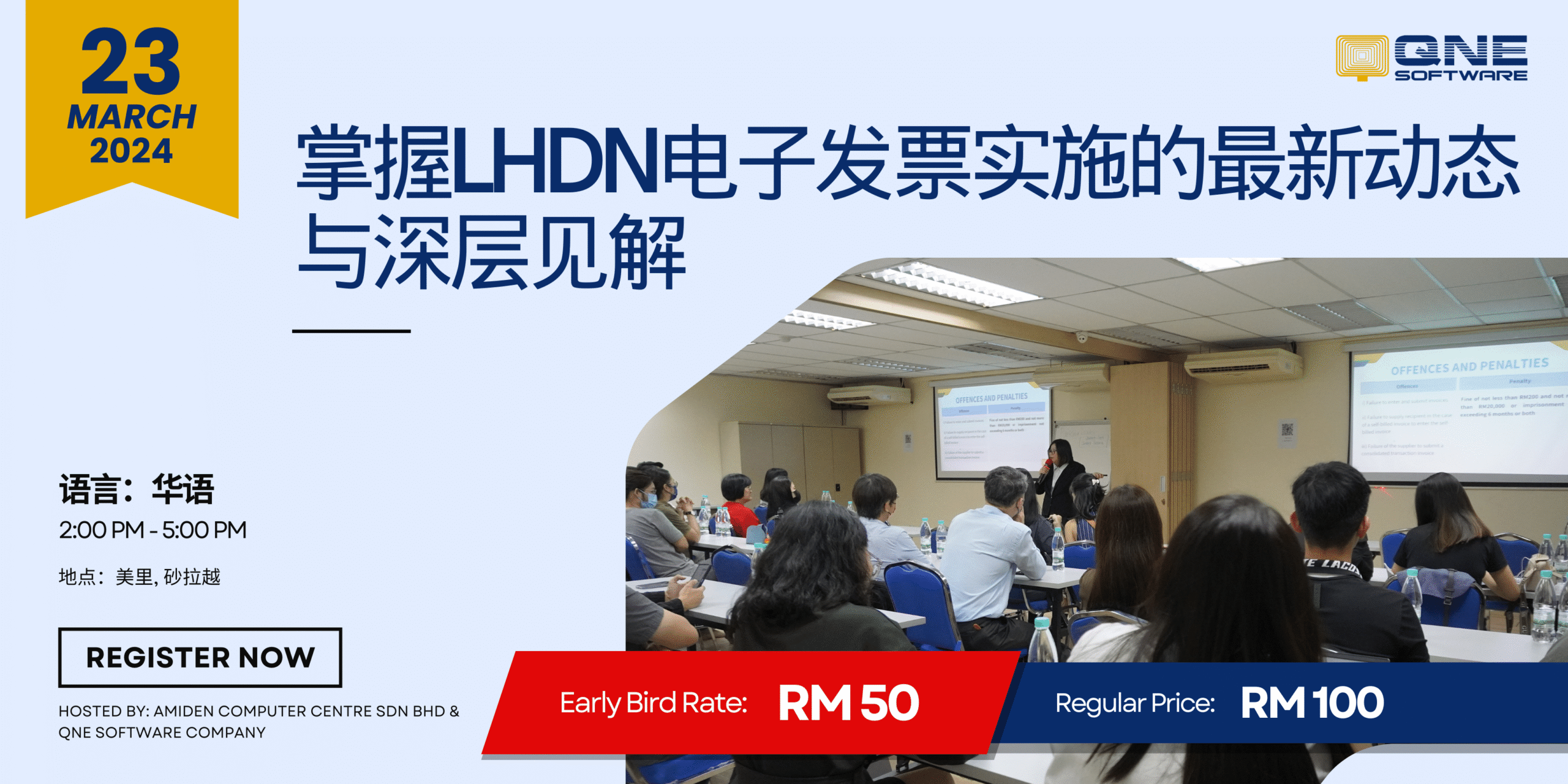 March 15, 2024 @ 1:30 pm - 5:00 pm 电子发票的更新以及 AI Cloud Accounting 如何管理 LHDN 电子发票处理 QNE HQ Suite 23-6, Plaza Cheong Hin, Jalan SP2/1, Section 2, Taman Serdang Perdana, 43300 Seri Kembangan, Selangor Darul Ehsan, Malaysia FREE