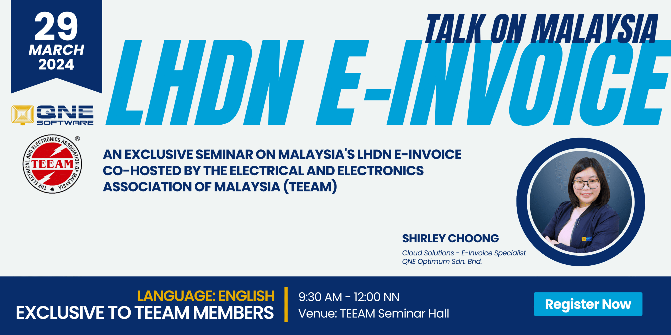 March 29, 2024 @ 9:30 am - 12:00 pm Talk on Malaysia LHDN e-invoice TEEAM Seminar Hall 2nd floor, No. 5-B, Jalan Gelugor, Off Jalan Kenanga, 55200 Kuala Lumpur, Malaysia