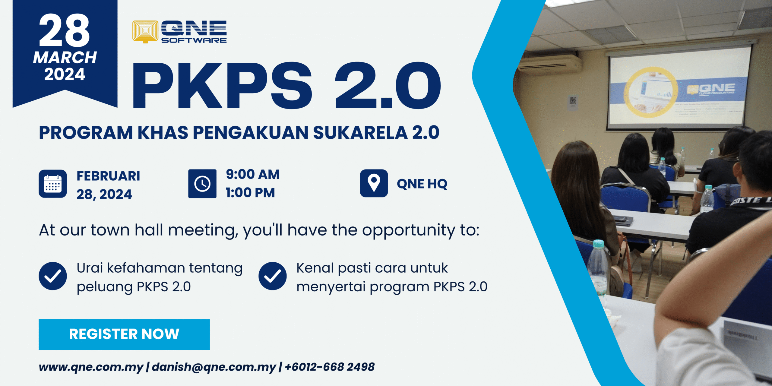 February 28, 2024 @ 9:00 am - 1:00 pm Program Khas Pengakuan Sukarela 2.0 QNE HQ Suite 23-6, Plaza Cheong Hin, Jalan SP2/1, Section 2, Taman Serdang Perdana, 43300 Seri Kembangan, Selangor Darul Ehsan, Malaysia MYR30