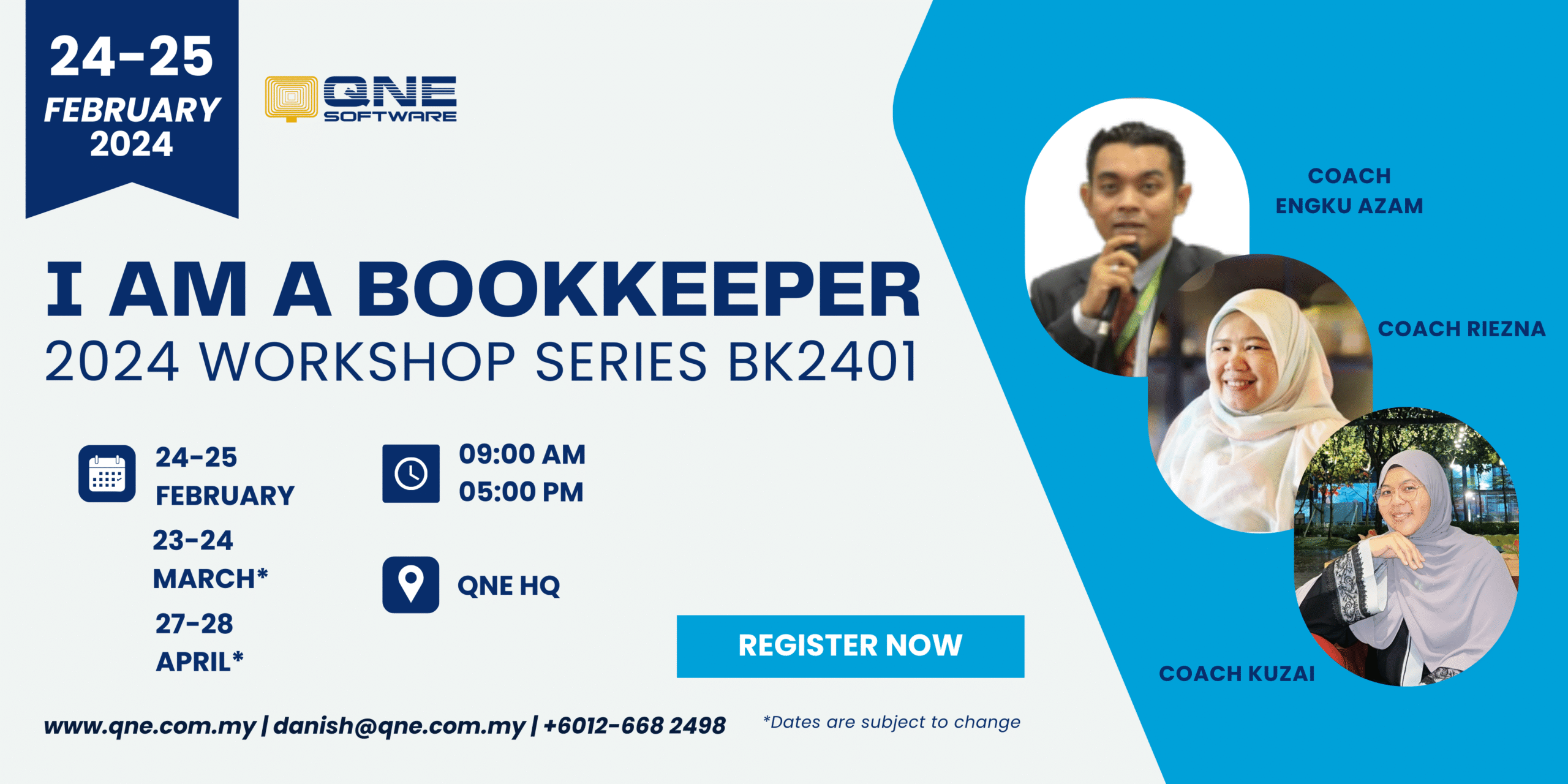 February 24, 2024 @ 9:00 am - February 25, 2024 @ 5:00 pm I am a Bookkeeper 2024 Workshop Series BK2401 QNE HQ Suite 23-6, Plaza Cheong Hin, Jalan SP2/1, Section 2, Taman Serdang Perdana, 43300 Seri Kembangan, Selangor Darul Ehsan, Malaysia MYR900