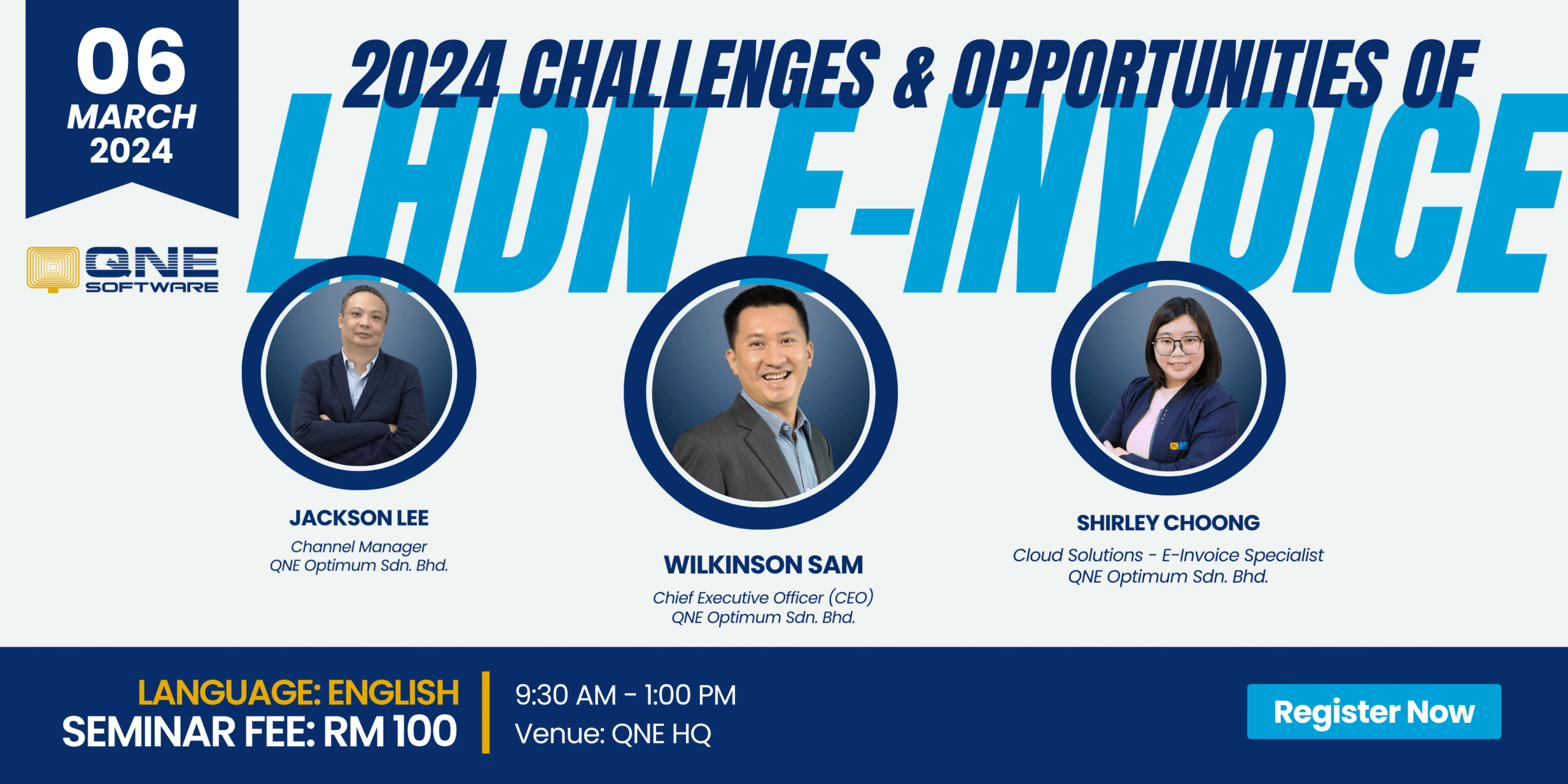 March 5, 2024 @ 9:30 am - 1:00 pm Cabaran Dan Peluang e-invois LHDN QNE HQ Suite 23-6, Plaza Cheong Hin, Jalan SP2/1, Section 2, Taman Serdang Perdana, 43300 Seri Kembangan, Selangor Darul Ehsan MYR100