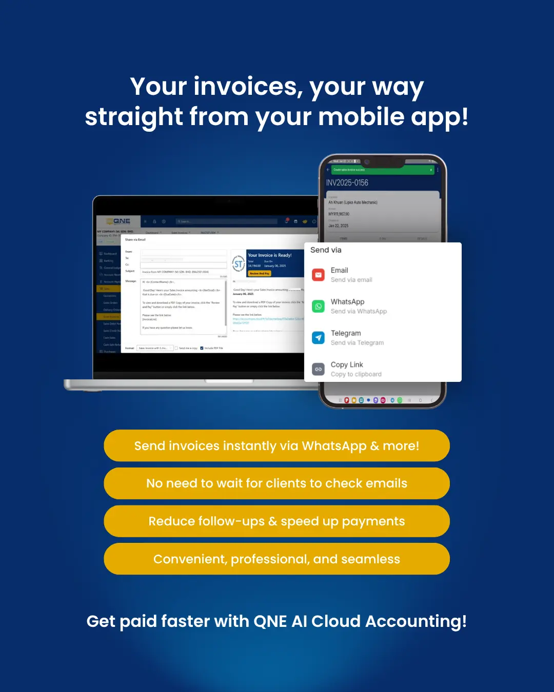 Exciting news for QNE AI Cloud Accounting users! You can now send invoices instantly via WhatsApp, Email, Telegram, or Copy Link—right from your phone. With this new feature on the QNE AI Cloud Accounting Mobile App, invoicing has never been faster or more convenient.