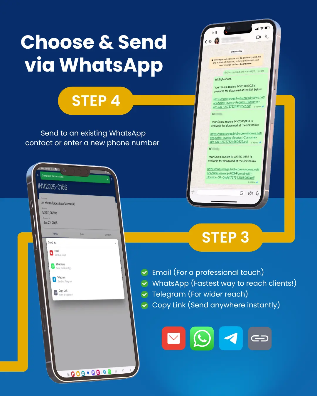- Send invoices instantly via WhatsApp, Email, Telegram, or Copy Link