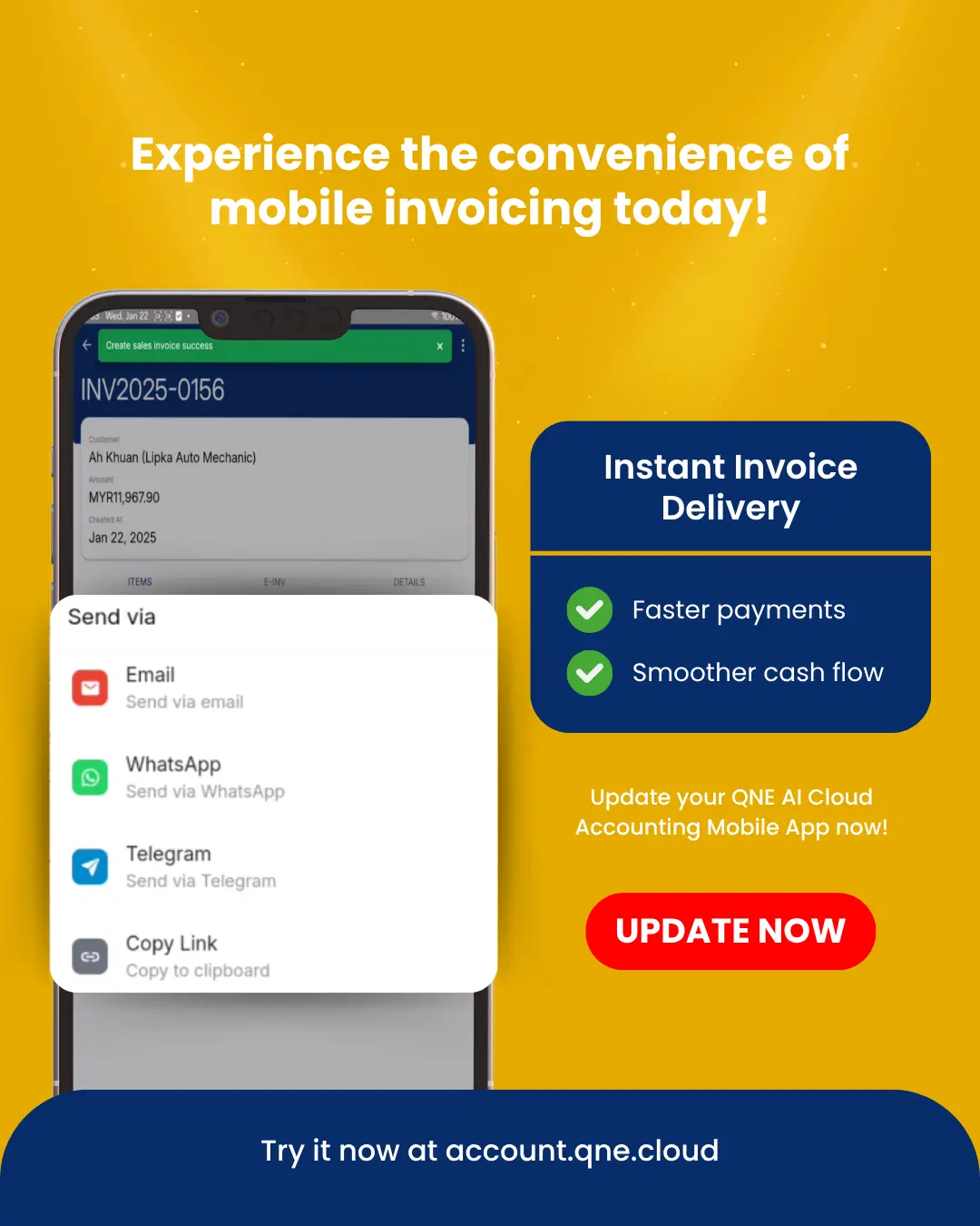 Experience the convenience of mobile invoicing today! Update your QNE AI Cloud Accounting Mobile App now!