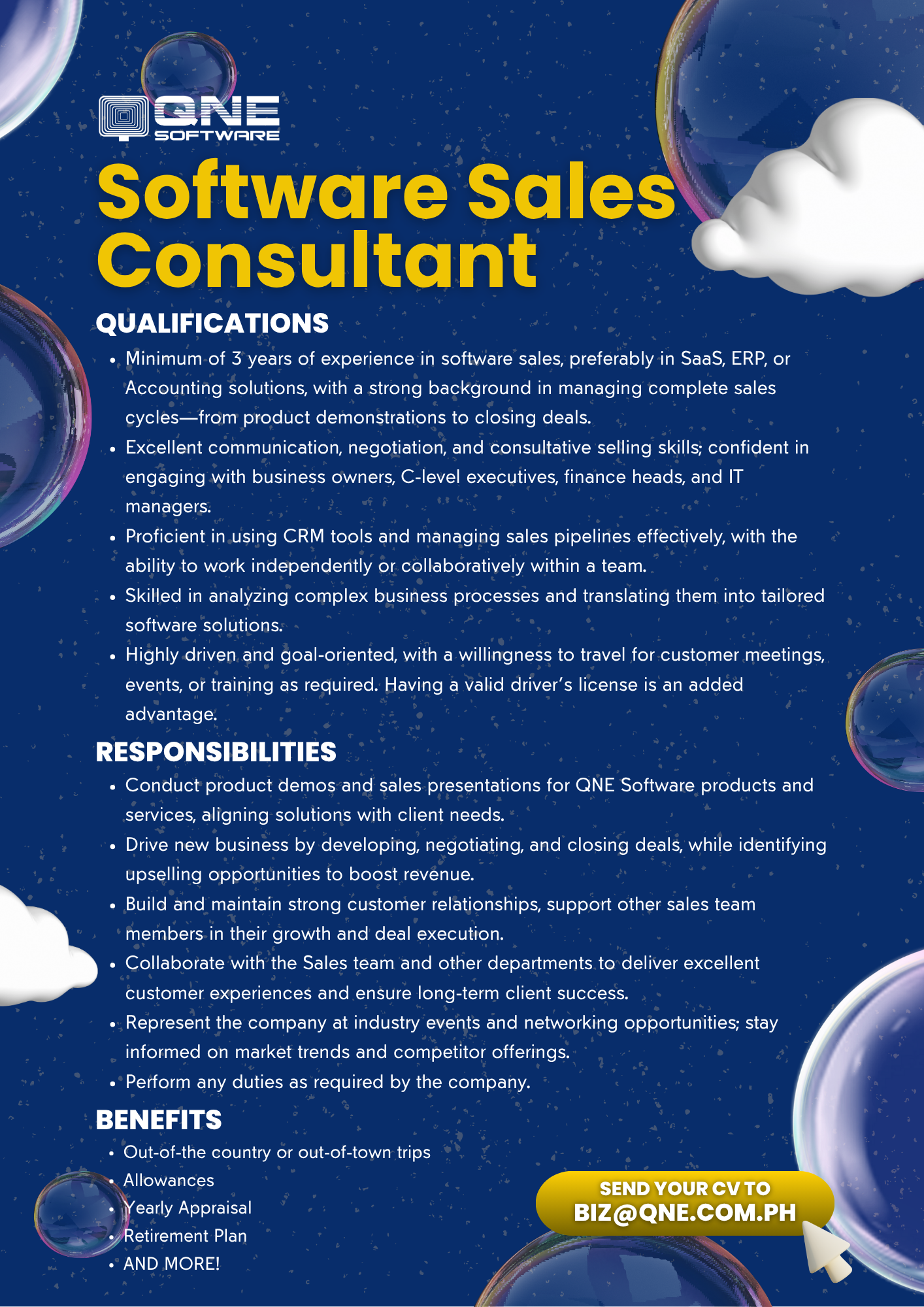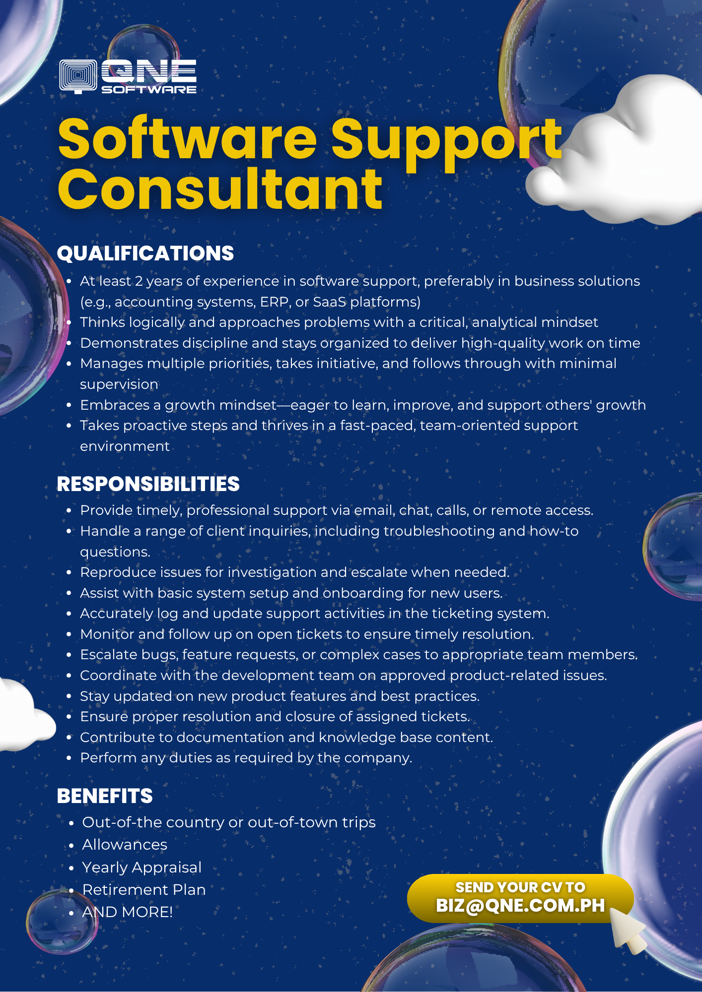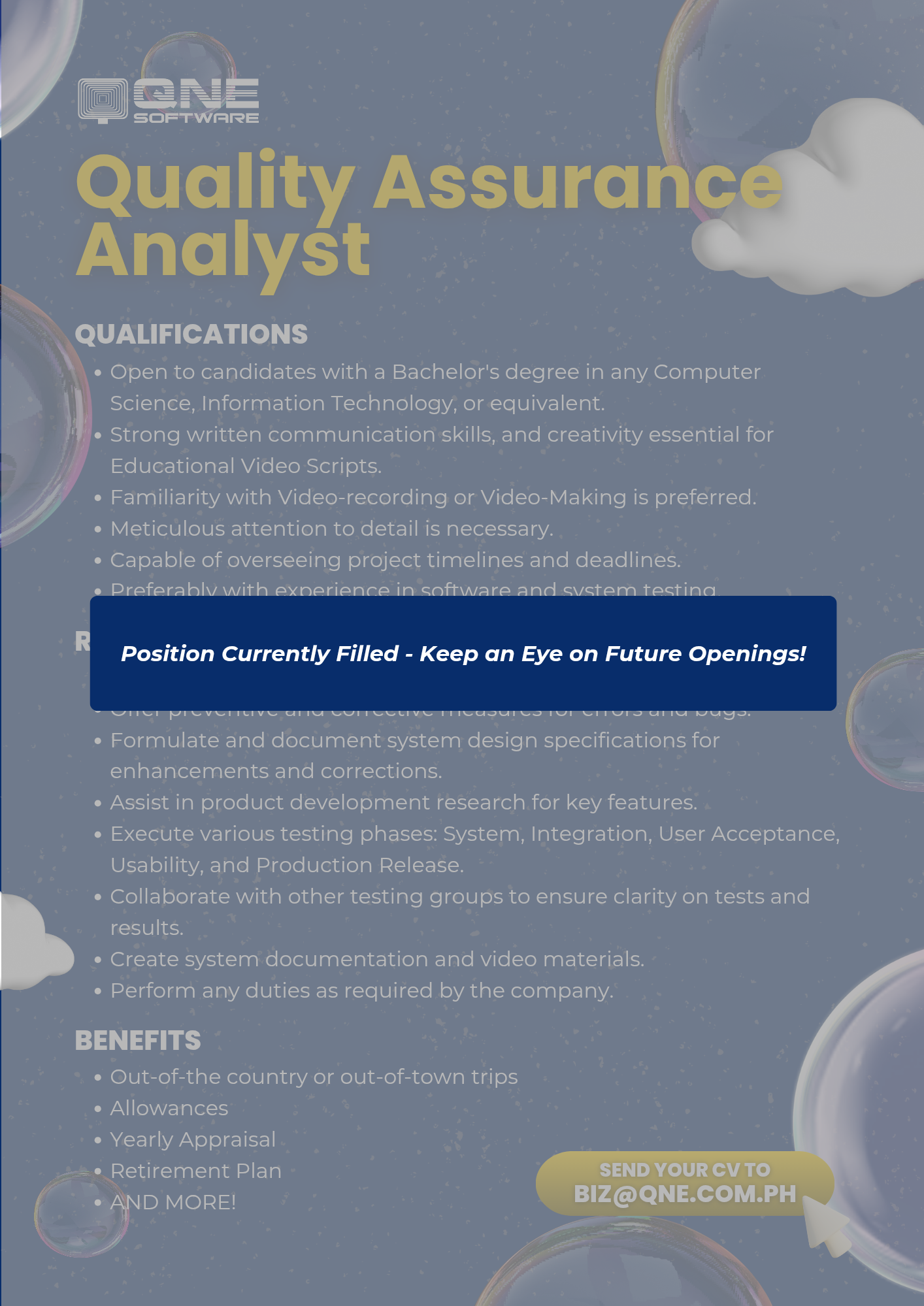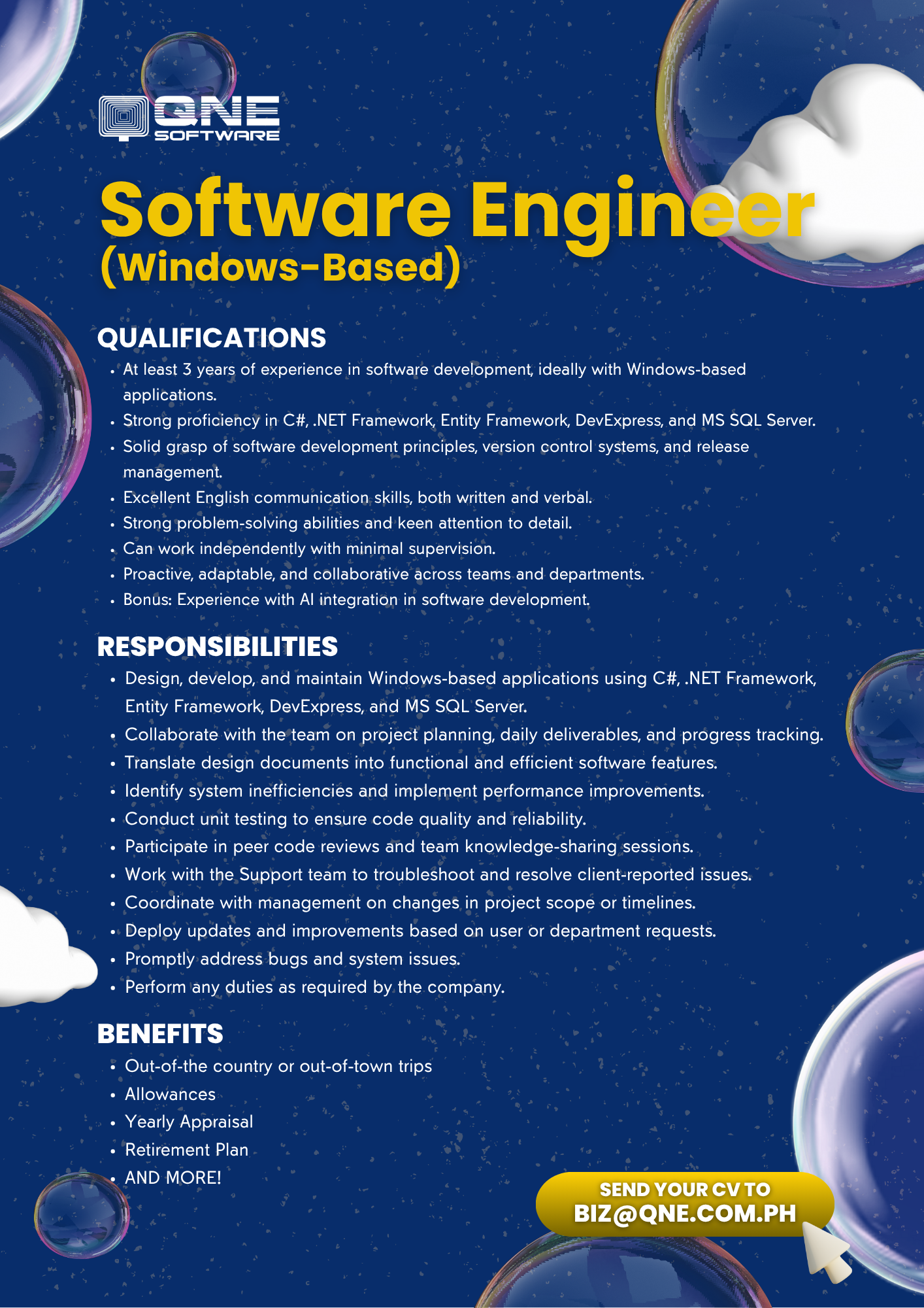 Submit your application now and discover how your career can flourish at QNE Software Philippines Inc. We look forward to welcoming you aboard!