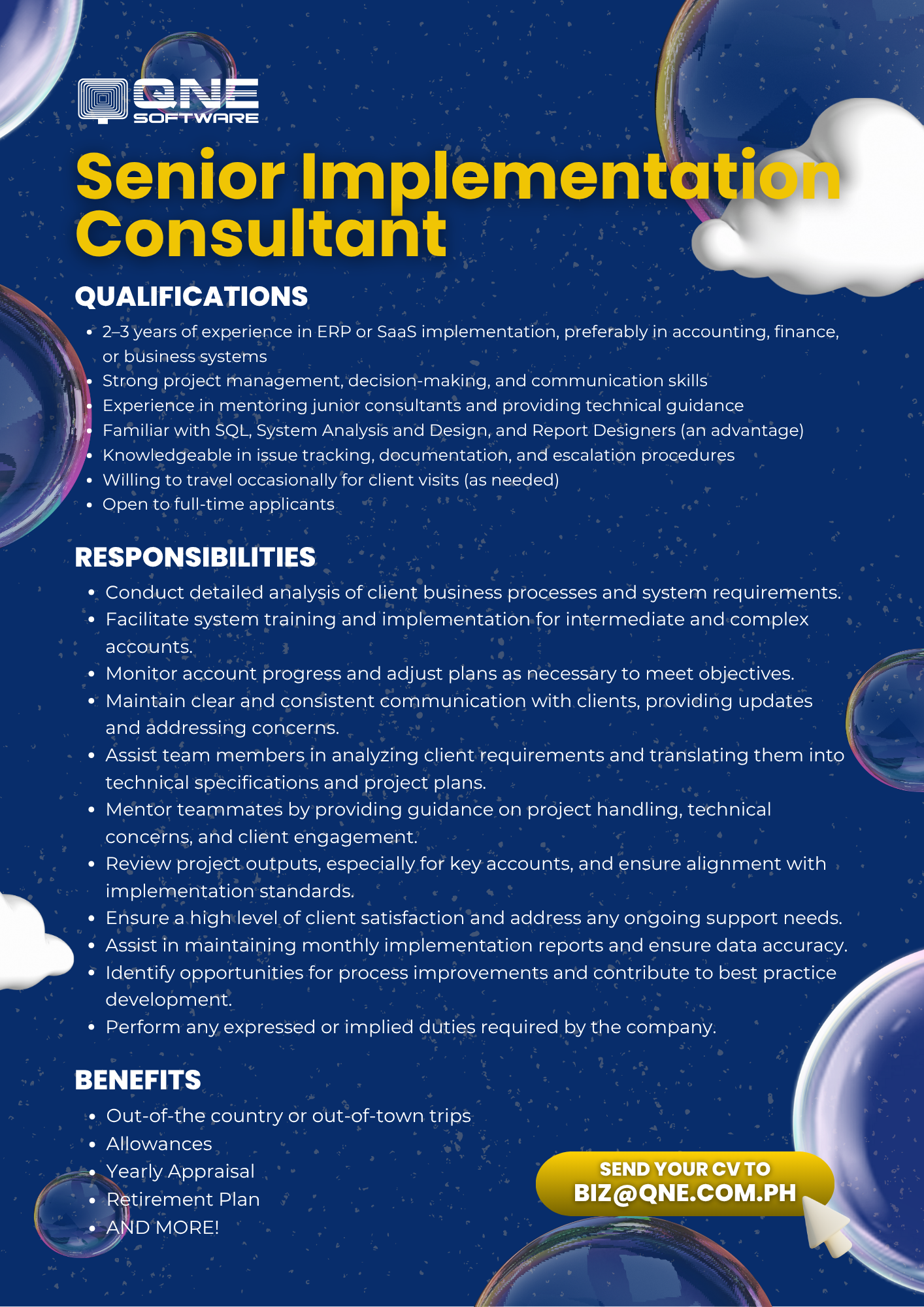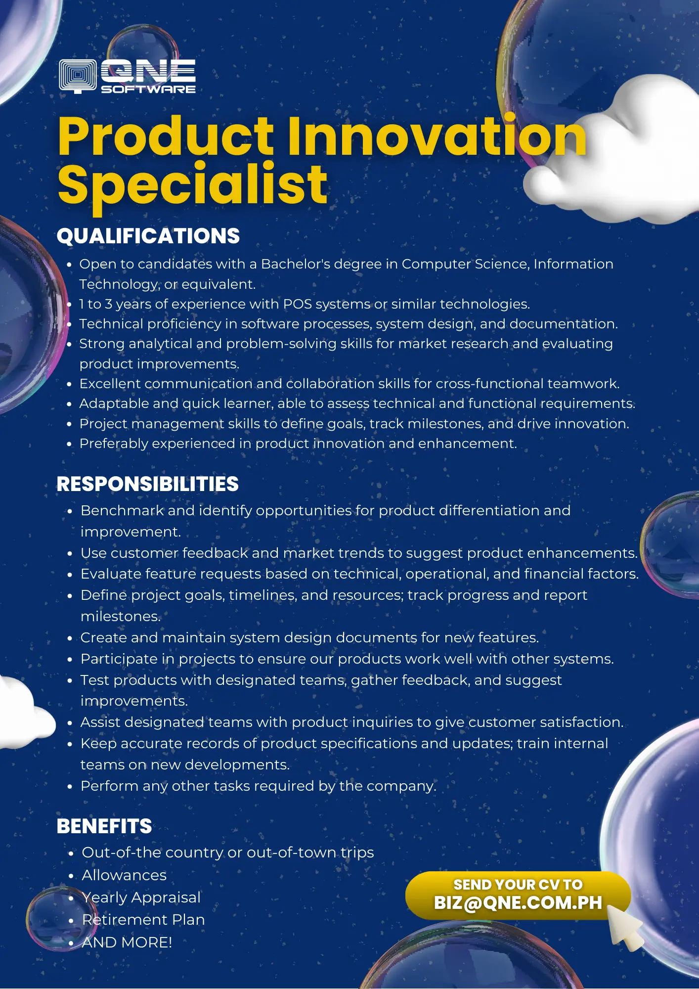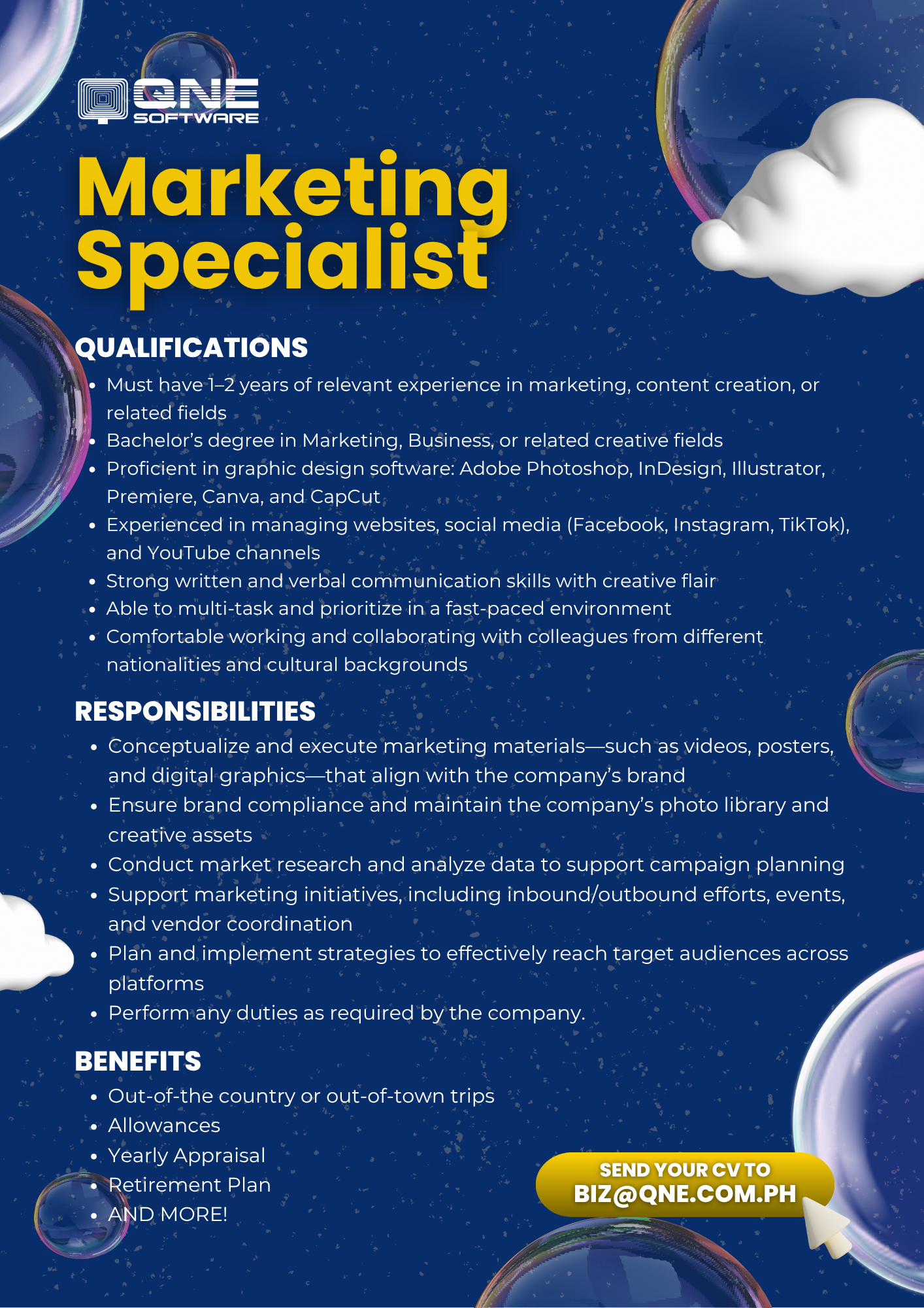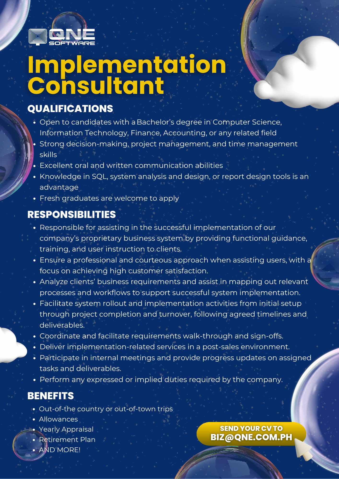 Submit your application now and discover how your career can flourish at QNE Software Philippines Inc. We look forward to welcoming you aboard!