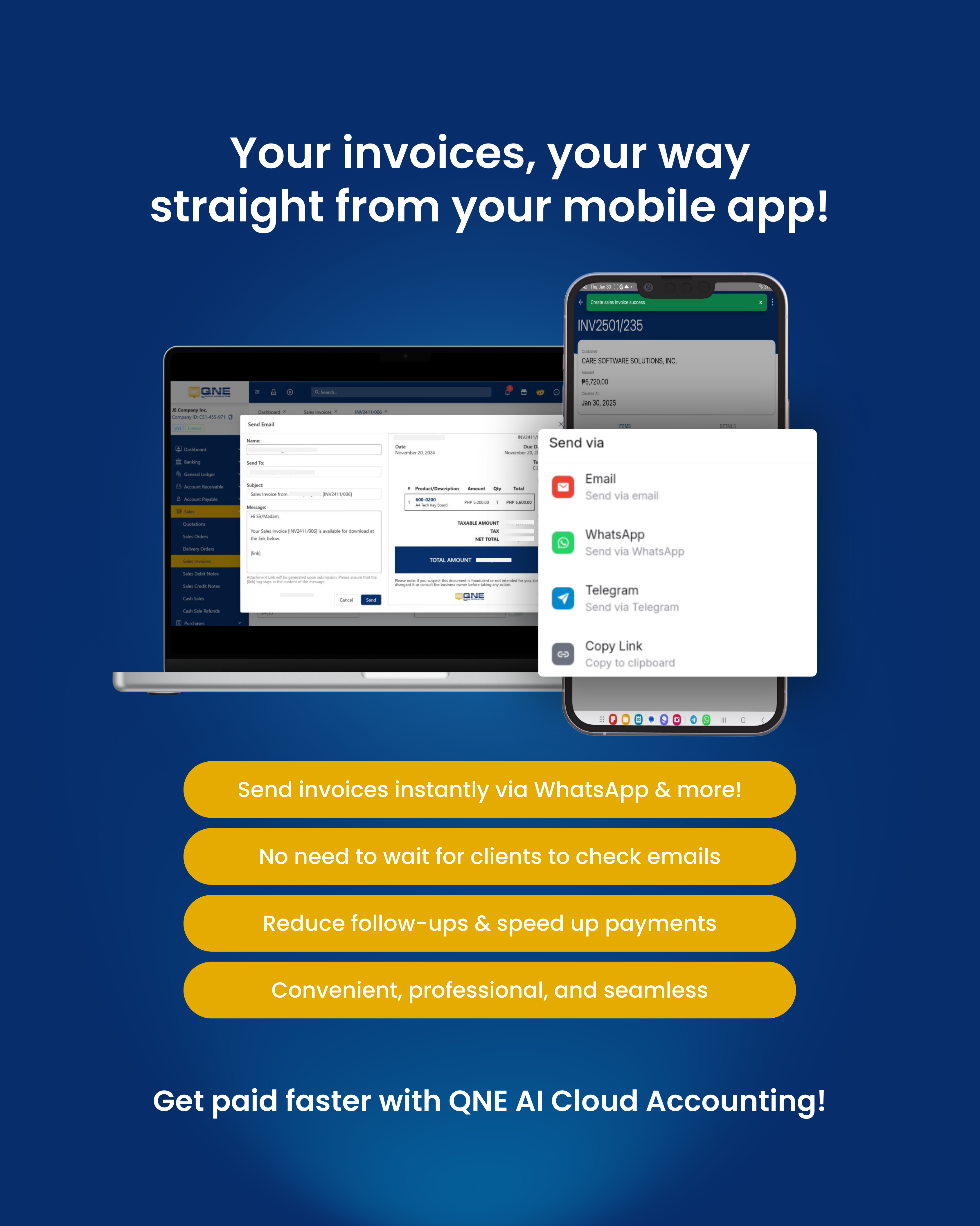 Exciting news for QNE AI Cloud Accounting users! You can now send invoices instantly via WhatsApp, Email, Telegram, or Copy Link—right from your phone. With this new feature on the QNE AI Cloud Accounting Mobile App, invoicing has never been faster or more convenient.