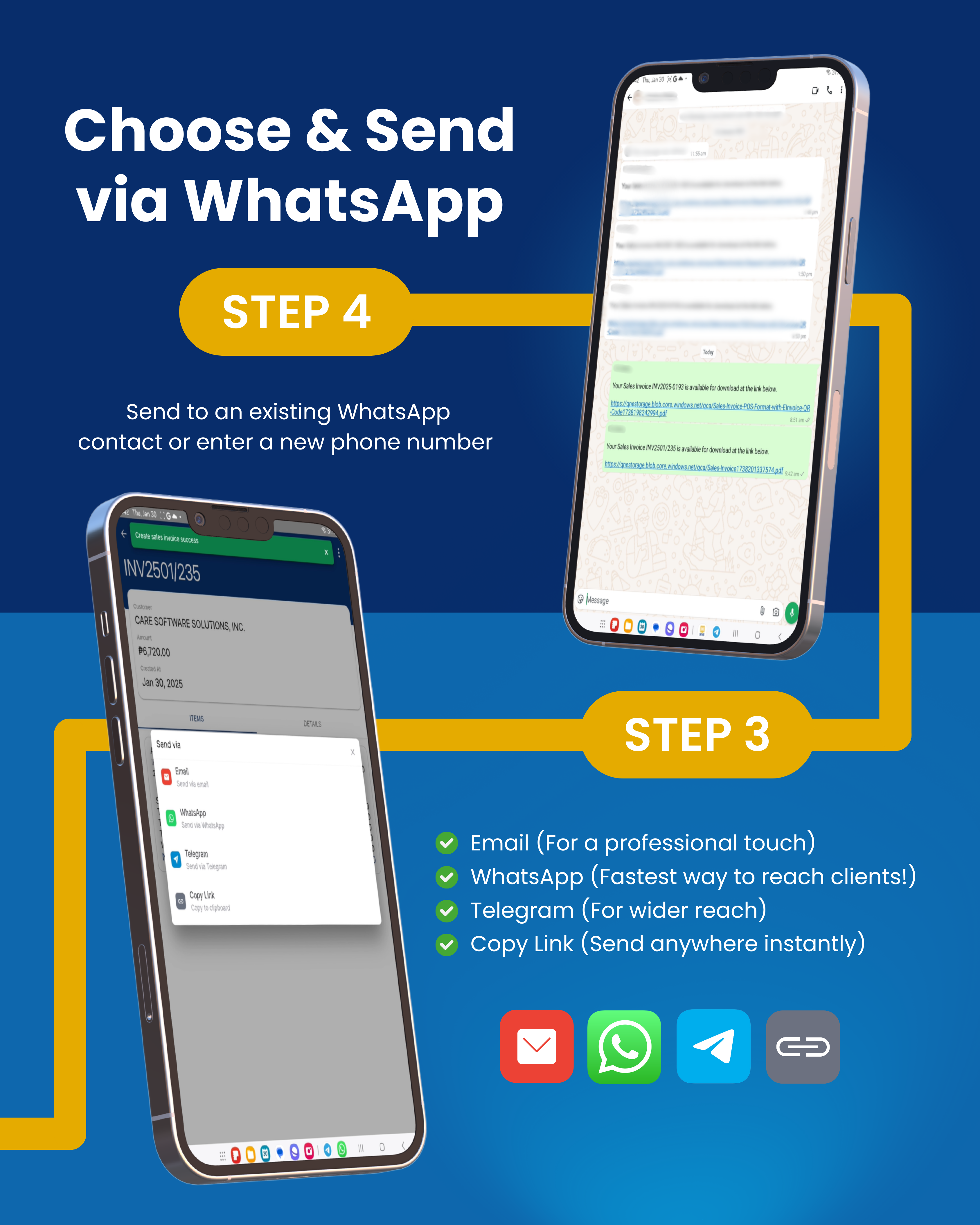 Send invoices instantly via WhatsApp, Email, Telegram, or Copy Link