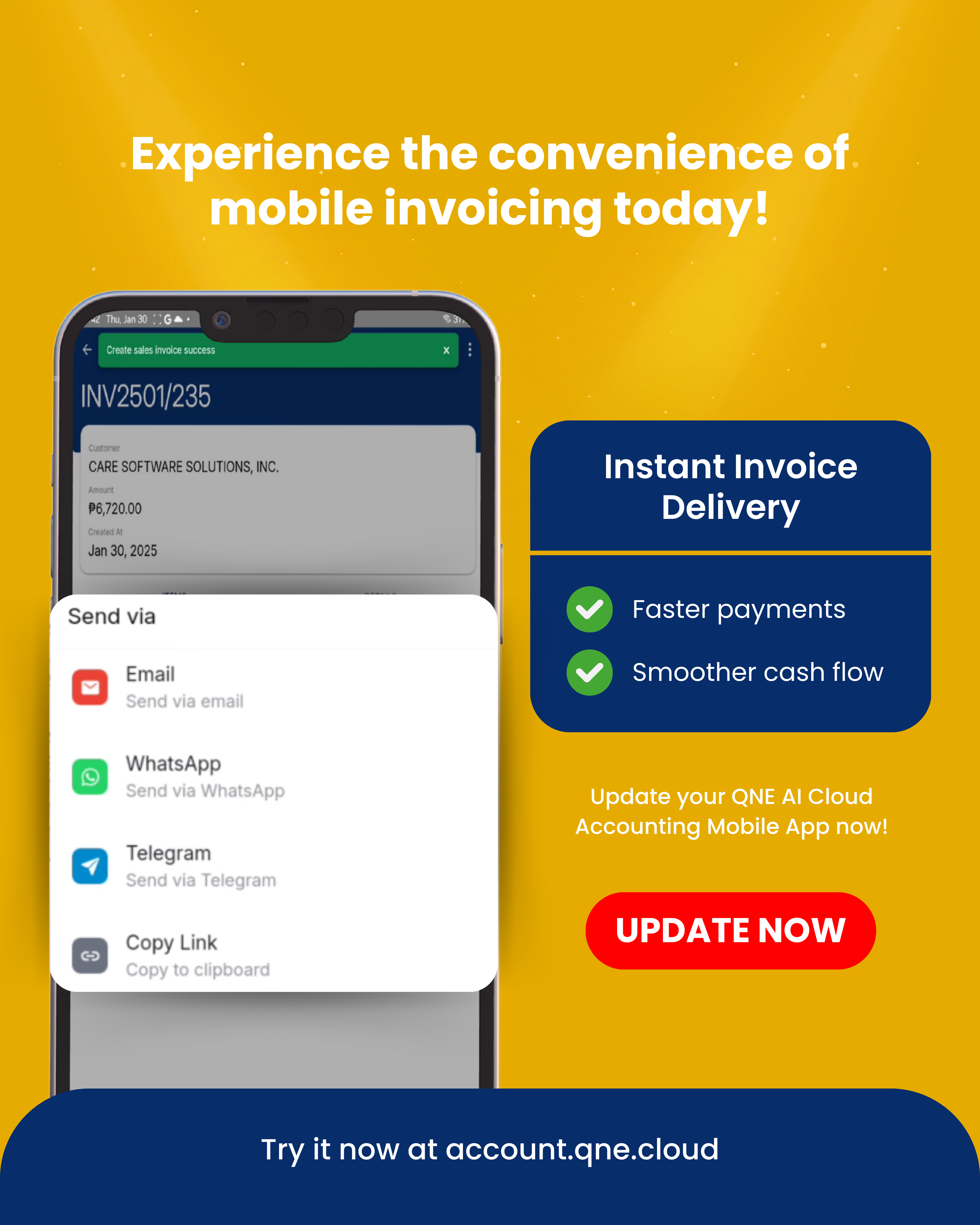 Experience the convenience of mobile invoicing today! Update your QNE AI Cloud Accounting Mobile App now!