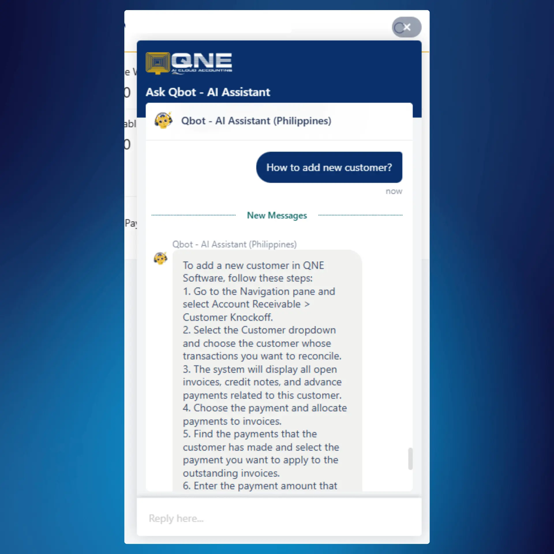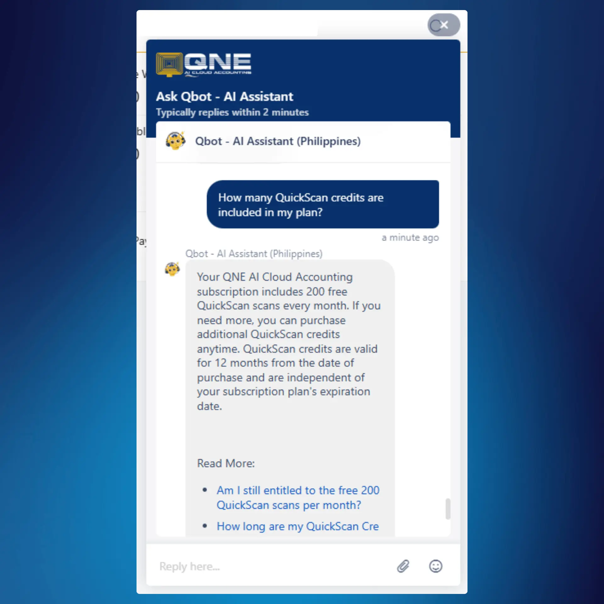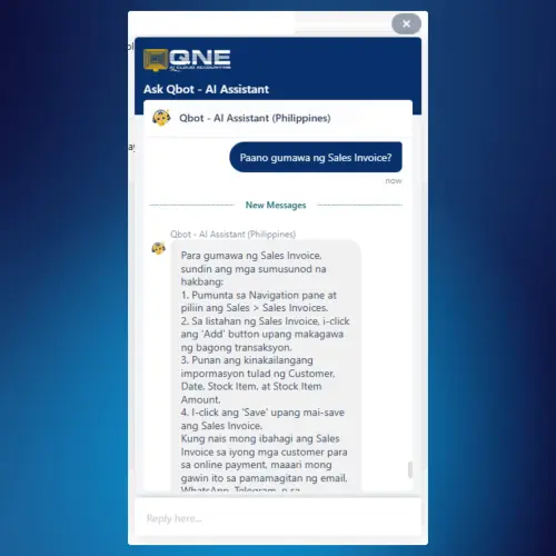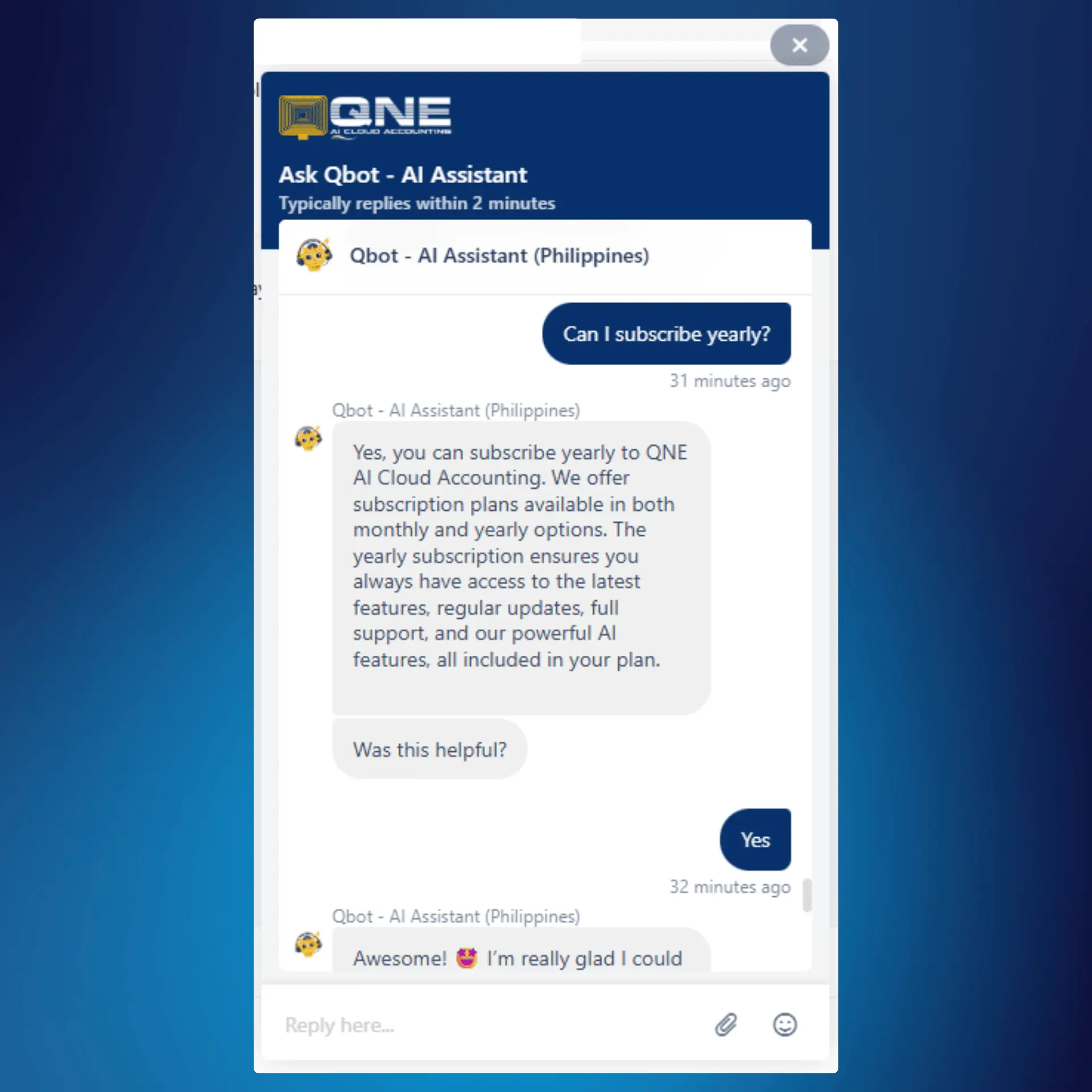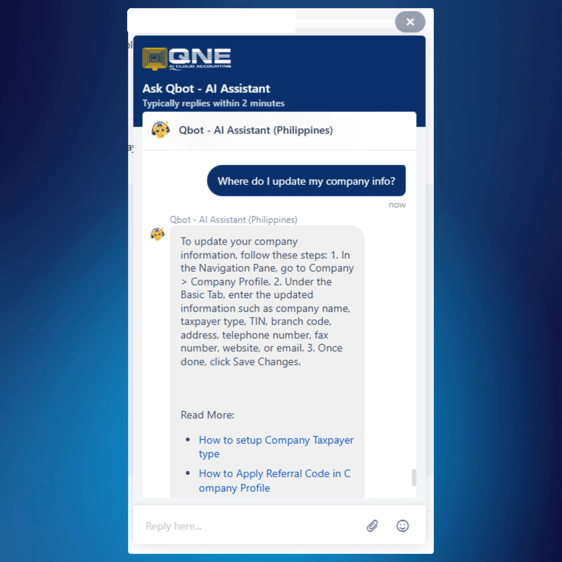 Whether you’re wondering “How do I generate a Sales Invoice?” or “Where do I update my company info?”, Qbot responds in seconds — no need to wait for support.