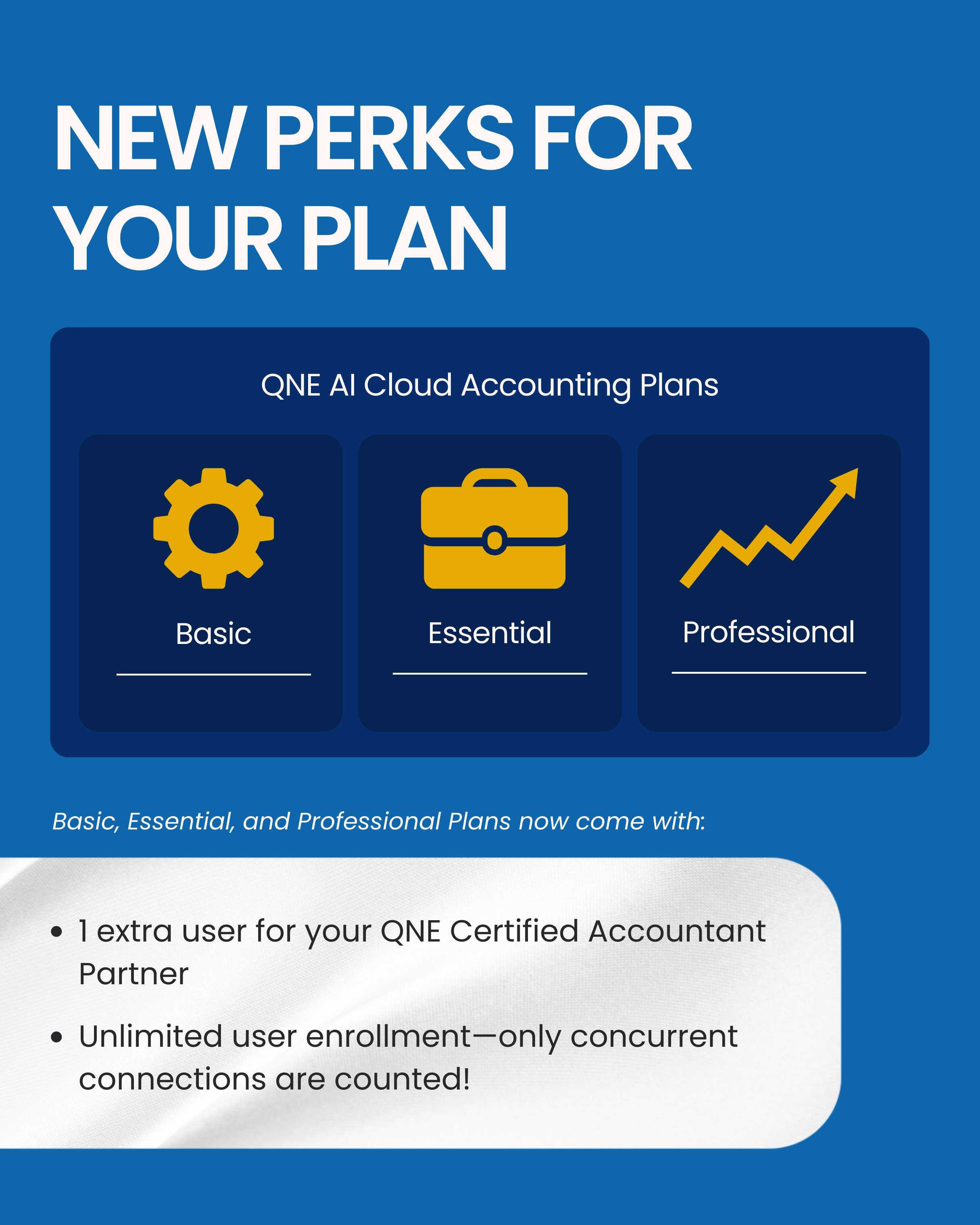 1 Extra User for Your QNE Certified Accountant Partner: In addition to the changes mentioned above, these plans will receive 1 additional user specifically for your QNE Certified Accountant Partner. This ensures that your accountant or bookkeeper can access the system without counting toward your active user limit, giving you even more value!